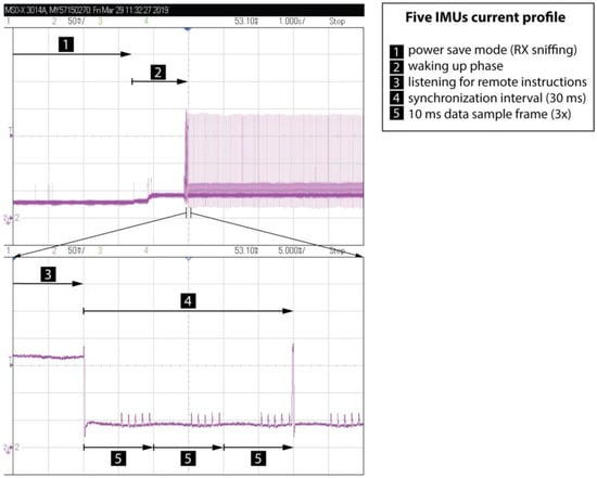 The oscilloscope traces in Figure 5 show the sum of the battery supply current from five remote IMU units. In the top plot, the first 3.5 s represent the “power-saving mode” labelled (1), where the current is zero, as expected. Just before 4 s and almost up to 5 s in this graph, the “wake-up” phase occurs (2). This phase transitions to the “listening mode,” labelled (3) in the bottom graph of Figure 5. The receivers in all the DWM modules consume a larger portion of the constant current, and the traffic between the master and each IMU unit increases the circuit activity and the current consumption. This phase of listening for remote commands ends with a current glitch at the beginning of each synchronization interval (4). The synchronization interval begins with the synchronization packet sent by the master and received by each IMU unit. When the activity of IMU unit stops, the currents drop down to the response slots assigned to each IMU unit.