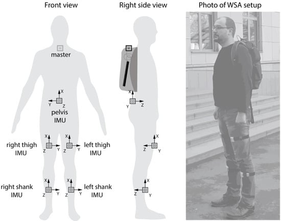 Similar to the above experiments, the subject was equipped with a complete set of WSA, including five IMU units, as shown in Figure 6. The session lasted 10 min, and the sampling rate was 100 Hz for each IMU and each variable. The same laptop PC with a Wi-Fi interface was in the backpack. The same software was used for the data acquisition and post-processing.