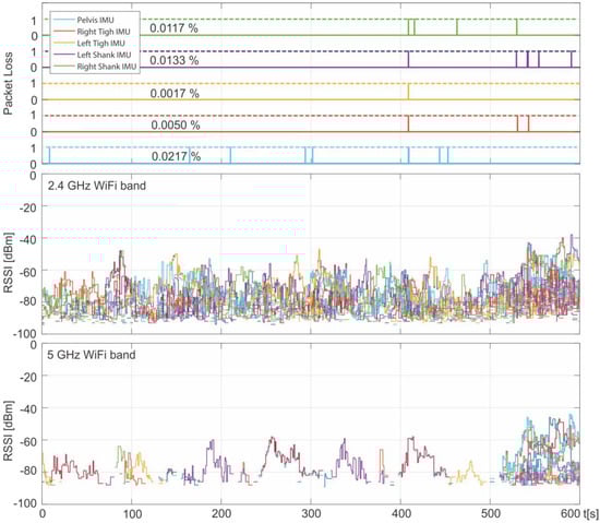 Figure 7 shows the traces of packet loss measured for the IMU units attached to the pelvis, right/left thigh, and right/left lower leg. Glitches appearing on the green, purple, yellow, orange, and blue traces represent single events of a single packet loss. Most traces are at the 0 mark, which represents no packet loss. Traces with jumps to the value 1 represent single packet losses. The middle graph shows the RSSI signal levels for different 2.4-GHz Wi-Fi band channels. The channels are identified by different colours. An index for the colour coding of the channels is not provided, as this would make Figure 7 even more complex without adding relevant information. The bottom diagram shows the RSSI signal levels for different channels in the 5-GHz Wi-Fi band. For the same reason as for the 2.5-GHz band, the colour traces are not coded.