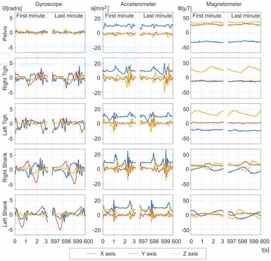 The first column in Figure 8 presents the 3D gyroscope signals for the IMUs attached to the pelvis in the top diagram and to the right/left thigh and right/left lower leg in the bottom diagrams of the same first column. In the same way, the second column lists the 3D accelerometer signals. The third column contains the 3D magnetometer signals for the same IMUs. It is important to note that in each of the 15 graphs, the left side shows the traces for the first minute of walking and the right side shows the traces for the last minute of walking. The colours blue, orange, and yellow represent the x-axis, y-axis, and z-axis signals, respectively.