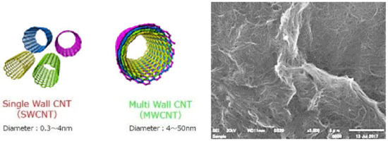 Illustration of SWCNTs and MWCNTs and a photo of dispersed SWCNTs (SEM 5000×).