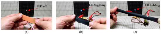 The paints used for the test material were three types of carbon-based paints, SWCNTs, carbon black, and graphite, which were manually applied to the foamed polypropylene plate using a general spray gun. This work was performed by Fukoku Co., Ltd. (Saitama, Japan) [31]. The coating thickness was calculated by measuring the thickness of the sample material before and after coating with a micrometer and calculating the difference. Figure 4a–c shows the various test materials created.