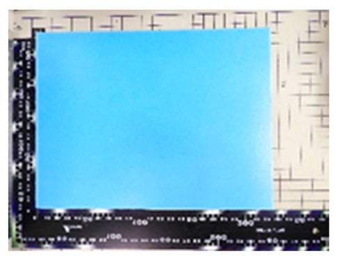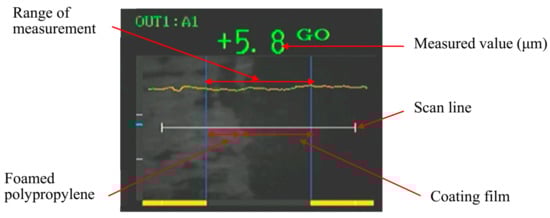 The amount of radio wave absorption of the CNT spray paint with a coating thickness of 16 μm is smaller than that of other paints, which is considered to be due to the fact that the coating thickness in the vicinity of the irradiation of radio waves is thin. In order to verify this, a part of the coating film of the test material used for the measurement was peeled off, and the coating thickness at the center of the test material was measured. The coating thickness was measured using a KEYENCE double-scan high-precision laser measuring instrument (LT-9500) and a sensor head with a camera function (LT-9010M). Figure 19 and Figure 20 show screen copies during measurement.