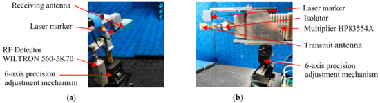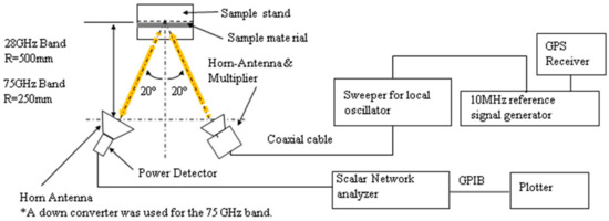 In the 28 GHz band, assuming that the test frequency is 28 GHz and the directional gain of the antenna is 14.5 dB, the distance that gives the boundary between the Fresnel region and the Franhofer region is calculated to be 243.7 mm. The position where the transmitting and receiving horn antennas were actually installed was set to 500 mm, which is about twice the distance of the boundary between the Fresnel region and the Franhofer region. In the 75 GHz band, each antenna was installed at a position of 250 mm. This is also about twice the distance of the boundary between the Fresnel region and the Franhofer region calculated from each condition. In this experiment, the nominal value was used for the antenna directivity gain (Gd), but if the gain was not disclosed, it could be calculated using Equation (2).