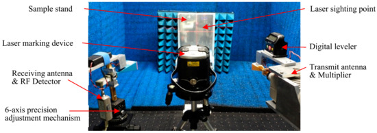 The transmitting and receiving horn antennas were installed in a 6-axis precision adjustment mechanism to adjust the height, angle, tilt, etc. These adjustments were made using a laser marking device and a digital level (See Figure 8). The laser marking device used here has a gyro mechanism and automatically draws horizontal and vertical laser beams on the front and both sides. This was used to adjust the installation position and angle of each antenna and the sample stand.