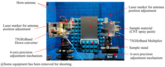 The purpose was to measure the amount of radio wave absorption of three types of carbon-based paints, including CNT spray paints, and to verify the superiority of CNT spray paints. As for the sample material, three thicknesses of each sample material were prepared in consideration of the influence of the coating amount. The frequencies to be verified were two frequency bands, the 28 GHz band used for 5G and the like and the 75 GHz band used for in-vehicle radar systems. The 77 GHz band is used for the in-vehicle radar system, but within this experiment, the measurement was performed at 75 GHz due to the equipment. The measurement method was carried out based on the Japanese Industrial Standard (JIS) R1679’s “Radio wave absorption characteristic measurement method in the millimeter wave band of the radio wave absorber” [30].