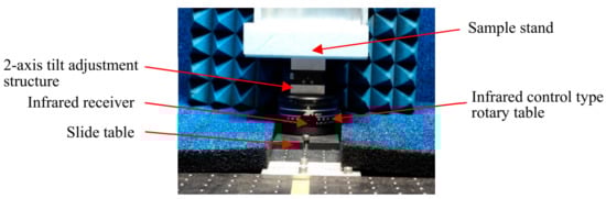 The test material stand was made of foamed polypropylene and was installed on an infrared-controlled rotary tape using a 2-axis precision stage to adjust the tilt. After installing the sample material, the installation angle of the sample material stand was finely adjusted by the infrared controller while monitoring the transmission loss (See Figure 10).