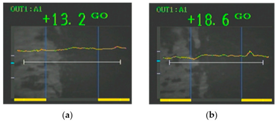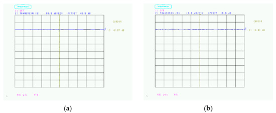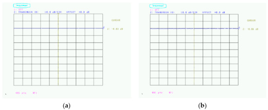 Changes in the amount of radio wave absorption depending on the board: (a) Calibration (−0.02 dB); (b) Foamed polypropylene (−0.06 dB).