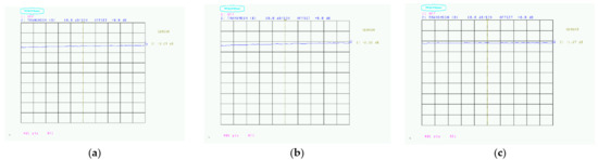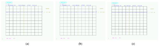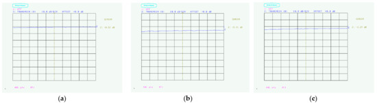 Radio wave absorption of carbon black paint: (a) Coating thickness 16 μm (3.29 dB); (b) Coating thickness 35 μm (2.32 dB); (c) Coating thickness 76 μm (1.62 dB).