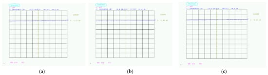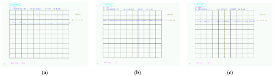 The marker for the level measurement of the Scalar network analyzer was set to 28 GHz, and the level resolution was set to 10 dB/1 Division. Figure 11, Figure 12, Figure 13 and Figure 14 show a copy of the Scalar network analyzer screen during measurement. Figure 11a is a copy of the measurement screen at the time of calibration. It can be confirmed that the value in the measurement frequency band is linear when nearly at 0 dB. Calibration was performed based on the Japanese Industrial Standard R1679 using a polished aluminum plate. Figure 11b is a screen copy of the calibration and the measurement of only the expanded polypropylene used for the substrate. It can be confirmed that there is no change from the value at the time of calibration even if the foamed polypropylene is installed. This indicates that the expanded polypropylene does not affect the radio wave absorption effect. The decibel value in parentheses indicates the amount of radio wave absorption.