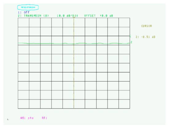 In the 75 GHz band, the Sweep Generator was set so that the signal output from the transmitting antenna had a center frequency of 75 GHz and a sweep frequency of 74.1 GHz to 75.9 GHz. The marker for the level measurement of the Scalar network analyzer was set to 75 GHz, and the level resolution was set to 10 dB/1 Division. Figure 15, Figure 16, Figure 17 and Figure 18 show screen copies of the Scalar network analyzer during measurement.