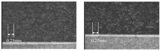 The black part on the right is the coating film, and the gray part on the left is the part where the coating film is peeled off. The numerical value at the top is the coating thickness at the center of the screen. The coating thickness was about 6–9 μm, and the thinnest part was 5.8 μm. (See Figure 19). In order to confirm the variation in coating thickness, the coating thickness at the top and bottom of the sample was also measured. The coating thickness was about 13–19 μm, and although there was a large variation, it could be seen that the coating was thicker than the central part (see Figure 20).