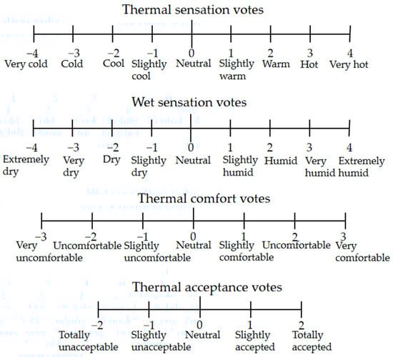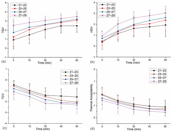 Comprehensive subjective evaluation voting (thermal sensation votes, humid sensation votes, thermal comfort votes, thermal acceptance votes) under four different working conditions (i.e., 21–23 °C, 23–25 °C, 25–27 °C and 27–29 °C). (a) TSV, (b) HSV, (c) TCV, (d) Thermal acceptability.