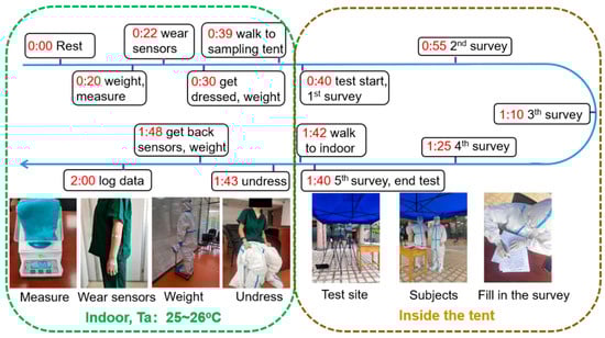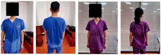 Participants wearing the experimental clothes: (a) full-body nonwoven disposable protective clothing, face mask, goggles and gloves; (b) surgical gown.
