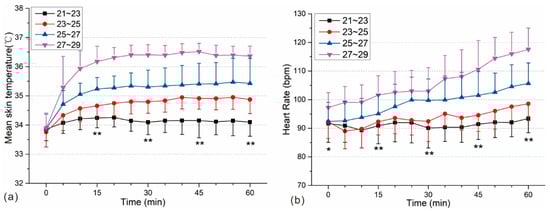 Variation of Tsk and HR with time under four different working conditions (i.e., 21–23 °C, 23–25 °C, 25–27 °C and 27–29 °C). (a) Mean skin temperature, (b) Heart Rate. Note: * and ** represent the correlation between WBGT and various parameters; * p < 0.05, ** p < 0.01.
