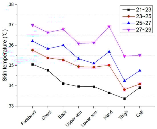 Average skin temperatures for eight different locations on the body of test participants under four different working conditions (i.e., 21–23 °C, 23–25 °C, 25–27 °C and 27–29 °C).