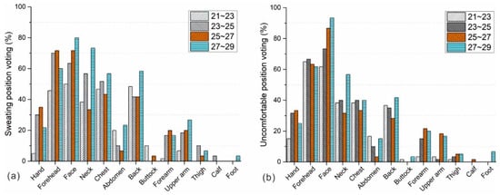 Voting of participants’ sweating and uncomfortable position under four different working conditions (i.e., 21–23 °C, 23–25 °C, 25–27 °C and 27–29 °C). (a) Sweating position voting, (b) Uncomfortable position voting.
