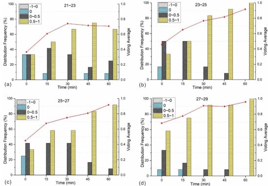 The variation of the humidity expectation vote with time under four different working conditions (i.e., 21–23 °C, 23–25 °C, 25–27 °C and 27–29 °C). (a) Working condition: 21–23 °C, (b) Working condition: 23–25 °C, (c) Working condition: 25–27 °C, (d) Working condition: 27–29 °C.