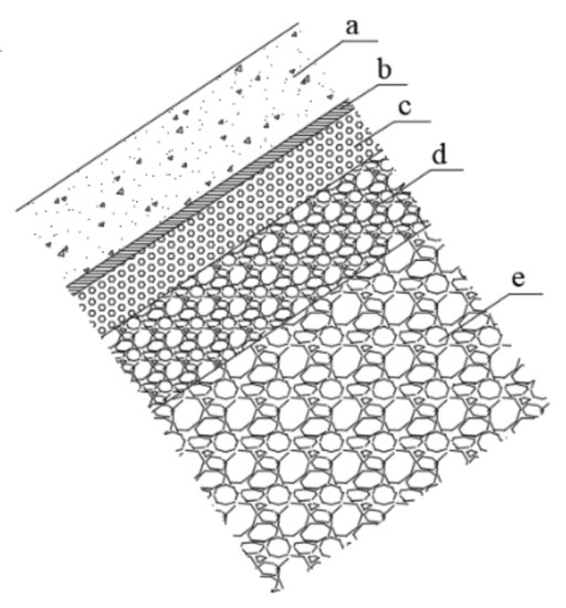 The proposed geomembrane surface barrier for a high rockfill dam ((a) protective layer; (b) composite geomembrane; (c) cushion layer; (d) transition layer; and (e) rockfill).