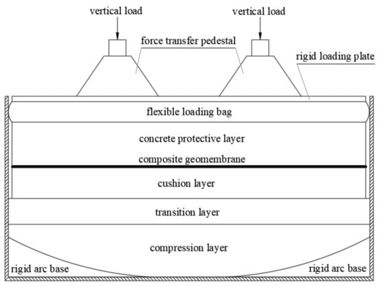In this study, the local structure model test method was used to investigate the mechanical and deformation performance under water pressure of the geomembrane surface barrier for a high rockfill dam on a deep overburden. Figure 1 show the composition and material of the proposed barrier. The local structure model was designed based on the plane strain problem. Figure 2 show the schematic of the model test. As shown in Figure 2, to simulate the actual water pressure load on the dam surface, normal flexible uniform pressure was applied on the top of the model through the flexible loading bag. The rigid arc base was set at the bottom of the model with the compression layer above it. This design made the structure produce an uneven settlement to simulate the bottom flexural deformation. During the loading process, various sensors were arranged to measure the mechanical and deformation states at different positions within the structure. Simultaneously, the deformation and failure behaviors of the entire structure, in addition to the interaction mode between adjacent layers, were observed through lateral transparent plexiglass.