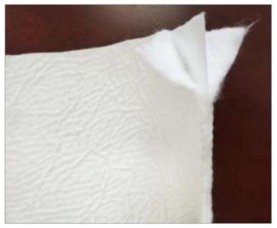- Composite geomembrane: The composite geomembrane is a sandwich structure comprising a geomembrane (with a thickness of 0.5–2.5 mm) layer laminated to one layer of needle-punched filament geotextile (with Mass per unit area of 250–500 g/m2) on both sides. After two days of curing of cushion layer, the composite geomembrane is directly laid onto the surface of the polyurethane bonded aggregate cushion. The sheer strength of the interface between the filament geotextile on the surface of the composite geomembrane and polyurethane bonded aggregate cushion maintains its stability [33].