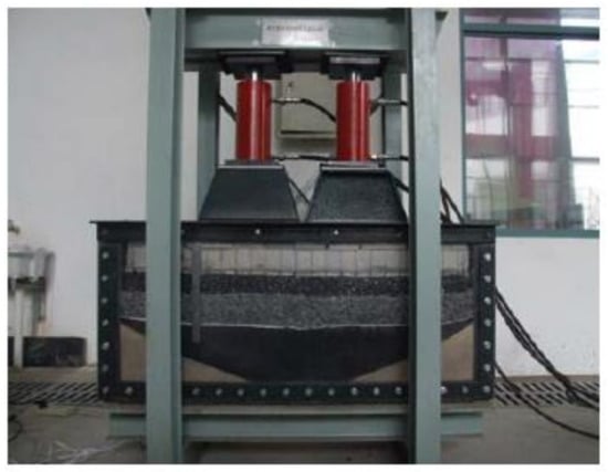 As shown in Figure 2, rubber particles with good elasticity and a size of 1–3 mm were used for the compression layer. These particles were filled at the bottom of the box to a height of 25 cm. A layer of soft non-woven geotextile was laid on the upper surface of the compression layer to isolate it from the upper transition layer. This soft high-strength non-woven geotextile layer prevented the transition layer gravel from embedding in the rubber particles, which would cause discontinuous deformation during the settling of the structure. A 20-cm-thick transition layer of coarse aggregates was filled on the non-woven geotextile. The coarse aggregates were composed of artificial basalt gravel with a particle size of 5–40 mm. The physical properties of the coarse aggregates for the transition layer are shown in Table 1. The compression layer and transition layer were flattened and compacted. The polyurethane bonded aggregate cushion was directly poured onto the upper surface of the transition layer. The cushion was filled and rolled to a thickness of 6 cm by mixing basalt gravel (particle size of 5–20 mm) with Polyurethane glue using a 1.5% glue to bone ratio. The polyurethane bonded aggregate is a type of elastic material with an elastic modulus of 0.81 GPa [7]. The protective layer of concrete with a compressive strength of 30 MPa was prefabricated with formwork. The elastic modulus and Poisson’s ratio of the protective layer are 30 Gpa and 0.16, respectively. First, the composite geomembrane was laid at the bottom of the formwork. Then, the concrete was poured onto the surface of the composite geomembrane to ensure a good bonding interface between the concrete and the geotextile on the surface of the composite geomembrane. This procedure simulated an actual construction process. As shown in Figure 4, the composite geomembrane comprised two layers of 400 g/m2 filament needled geotextile and one layer of 0.8-mm-thick polythene geomembrane. The elastic modulus and Poisson’s ratio of geomembrane are 230 Mpa and 0.475, respectively. Fresh basalt coarse aggregates with a particle size of <20 mm were selected to prevent the situ-cast concrete from puncturing the composite geomembrane. The thickness of the protective layer in the model was 8 cm. The formwork was removed after 28 days of curing. Figure 5 show an image of the whole model before testing.