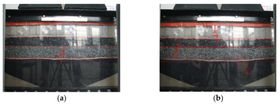 Under the top flexible pressure, the flexural deformation at the bottom of the model was continuously transmitted to the top. This caused the tensile stress at the middle part of the bottom of the protective layer to reach the tensile strength, which resulted in cracking and failure. With a further increase in load, the crack extended to the top, and the width of the crack increased. However, when the composite geomembrane was subjected to tensile load, the crack extension became restricted despite the increase in load. Figure 15 show the final cracks in the protective layer. The maximum width of the final cracks was 4.0 mm. The crack extended close to the top edge but did not fully penetrate. After cracking, the protection layer did not have dislocation deformation because of the limitation of the composite geomembrane and the suitable rigidity of the polyurethane bonded aggregate cushion layer at the bottom. Due to the limitation of the test conditions, the real water seepage pressure was not simulated. In a real situation, seepage pressure and the phreatic surface will develop in the granular transition layer and dam body if the protective layer cracks [35]. That may cause the larger flexural deformation of the cushion and lead to further tension failure of the geomembrane. Therefore, besides paying attention to the strength and deformation of the cushion and transition layer, the gradation of granular materials may be designed according to the requirements of seepage stability and filtration criteria.