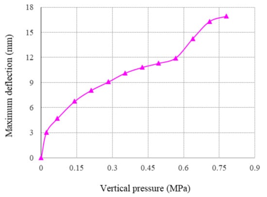 Figure 8 show the curve of the maximum deflection at the bottom of the transition layer. During the test, the curve changed with the uniform pressure load at the top of the model. Examinations of Figure 8 show that during the initial stage of loading, the maximum deflection at the bottom of the transition layer rapidly increased with the increasing load. Then, the growth rate stabilized and increased approximately linearly with increasing load. When the load reached 0.55 MPa, the maximum deflection started to rapidly increase and finally stabilized. When the bottom of the protective layer cracked, the maximum deflection of the bottom of the transition layer was 12 mm (i.e., relative deflection = 1/70). When the curve finally became horizontal, the maximum deflection was 17 mm (i.e., relative deflection = 1/49.4). It should be noted that obvious sheer and dislocation deformation can be observed in the coarse granular aggregates of the transition layer during the tests. That may result in dilatancy deformation [34] and affect the stress and deformation behavior of the upper cushion and geomembrane. However, the main focus of the experiment is to investigate the deformation behavior of the barrier, especially the cushion layer, composite geomembrane and protective layer. Therefore, no elaborate monitoring and analysis on the dilatancy behavior of the transition layer (granular material) were carried out in the test process. In future studies, more elaborate tests can be designed to study the effect of the dilatancy of granular cushion material on the deformation behavior of the geomembrane barrier.