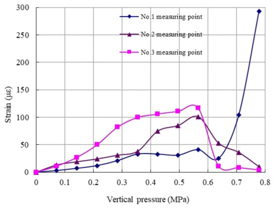 Examination of Figure 10 indicated that the strain at each measuring point slowly increased with the increasing load during the initial loading stage. When the load reached 0.5–0.6 MPa, the strain at each measuring point suddenly changed. The strain at the No.1 measuring point rapidly increased and reached the maximum value of 295 με. Simultaneously, the strain at the No. 2 and No. 3 measuring points suddenly decreased. For the composite geomembrane in the model, the upper part comprised a rigid concrete protective layer. The lower part comprised a relatively flexible polyurethane bonded aggregate cushion along with the transition layer. In the initial stage of loading, the deflection of the upper rigid concrete protective layer was very small; however, the lower part was a flexible structure. Thus, the specific boundary conditions at the bottom of the model resulted in the normal pressures at both ends of the composite geomembrane being greater than that in the middle. The sheer force between composite geomembrane and cushion layers at both ends was greater than in the middle. Due to the sheer displacement between the composite geomembrane and cushion layer, the sheer force was transferred to the composite geomembrane. The strains at both ends of the composite geomembrane were greater than in the middle. When the load reached 0.55 MPa, the middle part at the bottom of the protective layer started to crack. This occurred where the composite geomembrane started to bear a larger tensile load, which caused the strain at the No.1 measuring point to suddenly increase. Due to the fact that the composite geomembrane and the protective layer were bonded together, there was no obvious sheer deformation between them under the large normal pressure. Thus, the sheer force was not transferred from the middle part to both ends. The middle part of the composite geomembrane bore more of the tensile load, and the tensile load at both ends decreased. Thus, the strain at the No. 2 and No. 3 measuring points suddenly decreased.