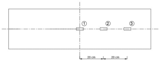 Position of strain gauges on the upper surface of the cushion layer. (①—position of measuring point No. 1; ②—position of measuring point No. 2; ③—position of measuring point No. 3).
