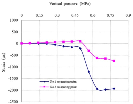 Examination of Figure 12 show that during the initial stage of loading, the No. 1 measuring point was under a compressive strain state, and the No. 2 measuring point was under a tensile strain state. However, the strain values at both measuring points were very small. The strain values at both measuring points on the surface of the cushion layer suddenly decreased when the load reached 0.5–0.6 MPa, resulting in a larger compressive strain. However, the strain stabilized with a further increase in load. This indicated that the deformation of the cushion layer was very small before the cracking of the protective layer. The deformation was attributed to the rigid displacement boundary condition imposed on the top of the cushion layer by the protective layer with large stiffness, which limited the flexural deformation of the cushion layer. When the load reached 0.5–0.6 MPa, the middle part of the bottom of the protective layer cracked. This forced the stiffness of the protective layer to decrease, and the relatively flexible cushion layer started to have flexural deformation, which caused the upper surface of the cushion layer to be under a compressive strain state. Then, the composite geomembrane at the bottom of the protective layer started to limit the propagation of the crack. The deformation of the protective layer tended to be stable. Moreover, the flexural deformation of the cushion layer stabilized because of the limitation of the protective layer. During the entire test process, the polyurethane bonded aggregate cushion layer demonstrated good flexibility. The cushion maintained good contact and coordinate deformation with the upper protective layer and the lower transition layer without dislocation or cracking failure.