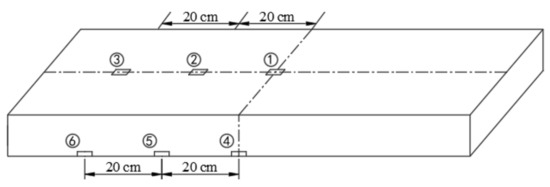 Position of strain gauges on the surface of the protective layer. (①—position of measuring point No. 1; ②—position of measuring point No. 2; ③—position of measuring point No. 3; ④—position of measuring point No. 4; ⑤—position of measuring point No. 5; ⑥—position of measuring point No. 6).