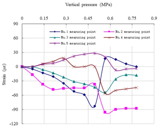 By analyzing the boundary conditions along with the mechanical and deformation characteristics of the protective layer, during the initial loading stage under uniform pressure, the protective layer was under a tension state at the bottom and a compression state at the top. Thus, the compressive strain was measured at the No. 1, No. 2, and No. 3 measuring points. The tensile strain was measured at the No. 4 and No. 5 measuring points. When the load reached 0.5–0.6 MPa, the measured value rapidly decreased to 0 because of cracking at the middle part of the bottom of the protective layer and the detachment failure of the strain gauge at the No. 1 measuring point. With the extension of the crack, the whole stiffness of the protective layer decreased, and the bending momentum decreased. Thus, with further increase in load, the deformation no longer increased, and the strain values at the No. 2, No. 3, No. 4, and No. 5 measuring points stabilized.