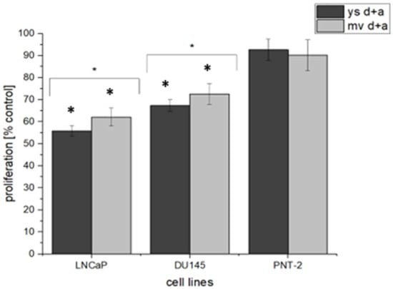 Effect of juice of young shoots of red cabbage (ys d + a) and of the mature vegetable (mv d + a) subjected to in vitro gastrointestinal digestion and absorption on DU145 and LNCaP prostate cancer cells and PNT-2 normal cancer cells proliferation in test with using Cell Proliferation ELISA, BrdU (Sigma-Aldrich). Values are expressed as means ± SD for n = 9, standardized to an untreated control set as 100%. Statistical significance was based on t-test * p ≤ 0.05.