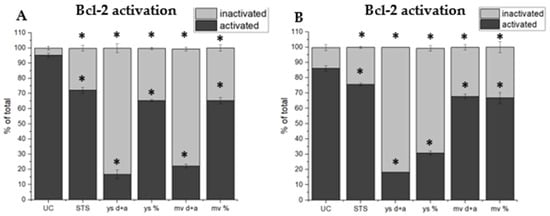 Cell apoptosis results of DU145 (A) and LNCaP (B) prostate cancer cells treated with experimental juices. Bcl-2 activation were obtained using flow cytometry (Muse® Cell Analyzer) and the Muse® Bcl-2 Activation Dual Detection Assay Kit. UC, untreated control. STS, staurosporine. ys d + a, juice of young shoots subjected to in vitro gastrointestinal digestion and absorption. ys%, fresh, 5% juice of young shoots. mv d + a, juice of the mature vegetable subjected to in vitro gastrointestinal digestion and absorption. mv%, fresh, 5% juice of the mature vegetable. Results are expressed as mean ± SD (n = 3). Statistical significance was based on ANOVA and Duncan’s a posteriori test. * p ≤ 0.05 compared to untreated control.