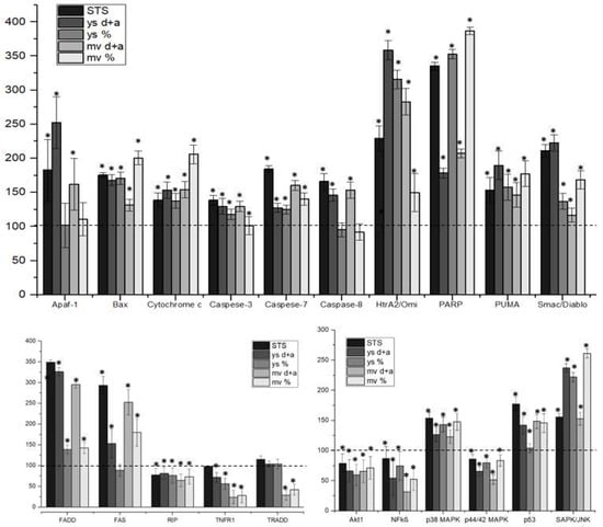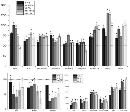 Expression of proteins involved in proliferation and apoptosis signaling in DU145 prostate cancer cells. DU145 prostate cancer cells were treated for 24 h with: STS, staurosporine. ys d + a, juice of young shoots subjected to in vitro gastrointestinal digestion and absorption. ys%, fresh, 5% juice of young shoots. mv d + a, juice of the mature vegetable subjected to in vitro gastrointestinal digestion and absorption. mv%, fresh, 5% juice of the mature vegetable. Results are expressed as a mean ± SD normalized to the internal reference protein (β-actin). Untreated negative control (UC) was set as 100% expression level. Statistical significance was based on t-test * p ≤ 0.05 vs. UC.