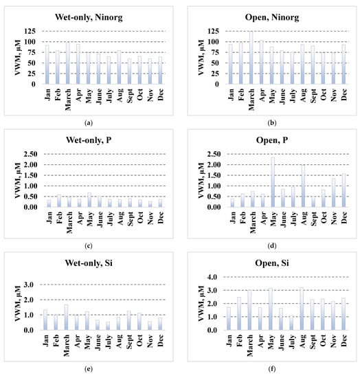 The intra-annual distribution of nutrients monthly volume-weighted mean concentrations (VWM) with the atmospheric precipitations is shown in Figure 2 and Figure 3.