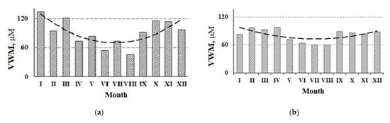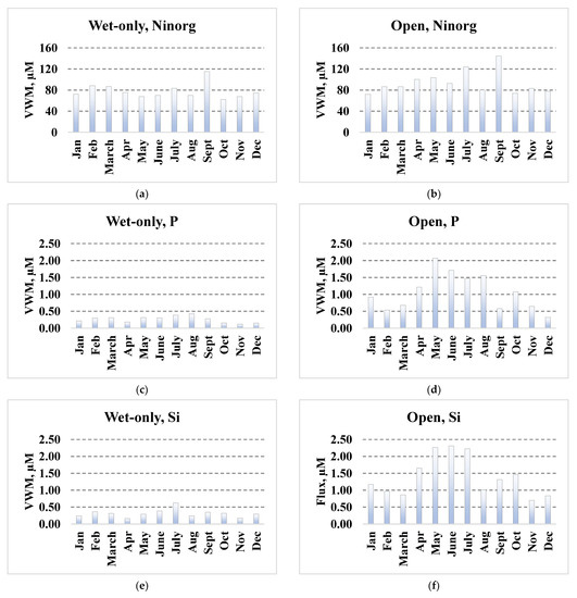 Intra-annual variations of volume-weighted mean concentrations (excluding cases of extremely high concentrations) of inorganic phosphorus reveal no statistically significant variations (Figure 2c,d) in Sevastopol, while these values increase in Katsiveli in April-August (Figure 3c,d).