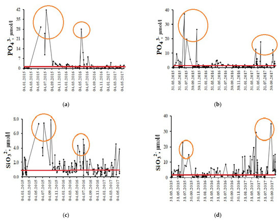 Variations of inorganic phosphorus (a,b) and silicon (c,d) concentrations in the atmospheric depositions in Katsiveli (a,c) and Sevastopol (b,d). Red line—volume-weighted mean concentration of nutrients, orange ovals—cases of significant excess of inorganic phosphorus and silicon concentrations.