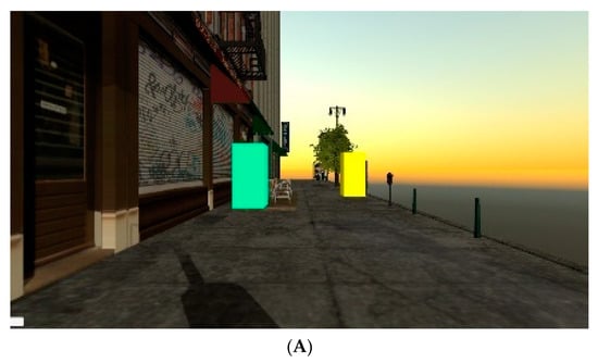 The participants’ task was to estimate the size and distance of stimuli in three separate environments. At the beginning of the study participants completed a demographic questionnaire. Then, they were introduced to the three VR environments. Three sets of two rectangular cuboids (set A, set B, and set C), one yellow one green, served as a target for both the distance and size estimation task. In each set, the two cuboids in different sizes were placed at two separated distances, near and far (see Figure 2). Near targets were placed 6 to 9 m from the participant. Far targets were placed 12 to 13 m from the participant. Figure 2 illustrates this. The stimuli were colored in yellow and green to allow them to stand out from the background and allow the participant to clearly distinguish between the two. We wanted to make participants rely solely on the spatial cues of the environment when they perform the spatial tasks. The target objects should not serve as a spatial cue. Therefore, we used rectangular cuboids as stimuli as these would not have features that could bias participants. Additionally, studies, such as Gerig et al. [34], showed that visual depth cues rendered in virtual environments may have a minor effect on participants’ performance while completing a task.