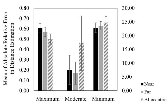 Relative error in distance estimation by environmental condition (maximum, moderate, and minimum). The left y axis represents the maximum and minimum conditions and the right y axis the moderate condition. Near and far bars represent the egocentric distances between the participant and each target. Allocentric bars represent the distance between the two targets. Error bars represent SE.