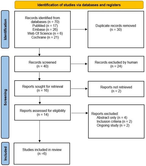 Our initial database search revealed 70 total results. Removing the 30 duplicates left us with 40 papers that would go into the screening process. After going through the screening process manually and applying the inclusion criteria, we were left with a total of six RCTs to analyze [14,15,29,30,31,32]. The identification, screening, and inclusion steps are all depicted in the PRISMA diagram (Figure 1).