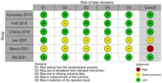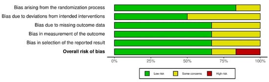 To evaluate bias risk, we applied the method described by Sterne et al. in 2019 [26]. They have revised the risk of bias tool (RoB), initially used widely in Cochrane or other systematic reviews [27]. This tool measures the risk of bias by analyzing data such as randomization, missing result data, measurement of outcomes or drift from intended interventions. In addition, it allows for researchers to rate the risk of bias as “low”, “some concerns”, or “high”. Graphical depiction was realized with the aid of the Robvis platform [28].