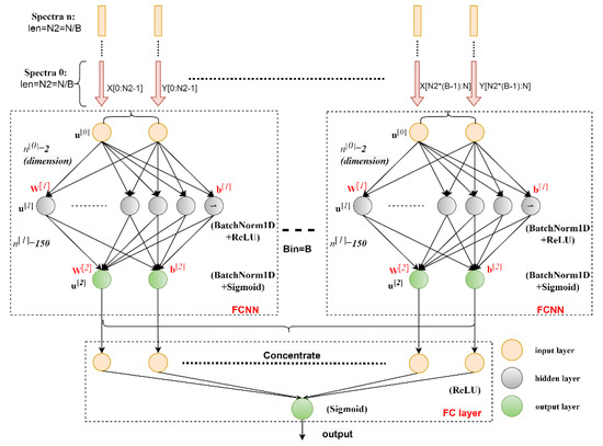 The structure of the end-to-end binned FCNN with the automatically capturing weighting factors model is shown in Figure 2, which is an extension of our previous work [60]. In this model, each FCNN sub-module consists of two fully connected layers (FCs), with each one followed by a batch normalization operation and a rectified linear unit (ReLU) [61] or sigmoid activation function [62] to speed up the training process and avoid overfitting. The input layer has 2 input neurons, corresponding to the dimensions (two coordinates) of the input spectra, the hidden layer has 150 neurons, and the output layer has 2 output neurons. Then, the output of these FCNN sub-modules is concentrated and fully connected to the final output neuron. The weighting factors learned by the last FC layer can assign different weights to different bins, thereby reducing the influence of the interval of indistinguishable features, and making the features in bins with high separability and reliability more dominant, which can better extract features and learn patterns from the input data. The reason why the sigmoid function is used instead of ReLU after the second FC layer is that we treat each FCNN sub-module as a complete classification model in each bin, so the function of the last FC layer is mainly to assign an overall classification influence weight to each bin.