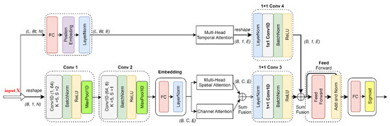 These two attention modules are fused together through element-wise addition. A convolution module 1 × 1 conv3 is performed after the parallel attention modules, which consists of a layer of normalization operation, 1 × 1 convolution, batch normalization, and a ReLU function. It is used for channel-wise pooling and dimensionality reduction. After this module, the output shape is (B, 1, E).