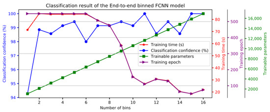 In the 2D space segmentation problem setting, the training information and classification result of the proposed end-to-end binned FCNN with the automatically capturing weighting factors model is shown in Figure 4. It can be seen from the result that the classification confidence increases as the number of bins increases, and finally achieves 100% confidence. In addition, we can also easily understand that although the trainable parameters increase linearly, as the required training epochs decrease, the required training time also decreases. The classification results show that the binned weighting technique can minimize or even eliminate the impact of misclassification of data points in the overlapping regions with low separability, and even greatly reduce the training time. When using 15 or 16 bins, the model consumes approximately 20 s training time.