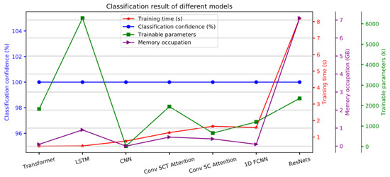When regarded as a general 1D time series data classification problem, all the applied or proposed models can achieve 100% classification confidence, and the classification boundaries obtained by different models are very stable, and only fluctuate in a small range, that is , as shown in Figure 5 and Table 1. Among these models, the CNN-based model requires the least training parameters. The LSTM-based model has the most trainable parameters, which is mainly introduced by the LSTM units, but its convergence speed is very fast, the training time is short, and the memory consumption is low. Regarding the training time, the Transformer-based model requires the least training time (0.449 s), followed by the LSTM-based model, which needs slightly more training time (0.463 s). At the same time, it can be clearly seen that the curve of memory usage during training has a similar trend to the training time curve. Although the 1D FCNN model requires 300 training epochs, it does not consume so much training time (1.576 s), which is only 3 times that of the LSTM-based model, and it does not consume much memory. From the result, it can be noted that the ResNets model consumes the most time training (8.208 s), and takes up the most memory, but the trainable parameters are still much less than the LSTM-based model. The reason for the long training time may be that there are a bunch of convolution kernels of different scales in this model. The related training information and results are listed in Table 1.