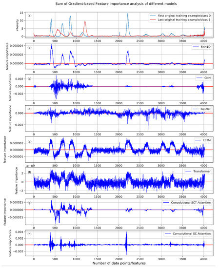 To better interpret the classification models, the feature importance attribution analysis is usually employed to quantify the interpretability of designed networks. An explainable and interpretable classification model would be expected to have an attribution map that can dynamically highlight the highly separable features (corresponding to the peak area in our application) while suppressing the indistinguishable features as much as possible. Since gradients can reflect the influence of each input data point on the current class prediction, and this analysis is model agnostic, does not require ground-truth labels [5], we conducted a feature importance analysis based on gradient backpropagation. In this experiment, we estimate the contribution of each input feature on the classification prediction of each model applied under the 1D time series classification setting, as shown in Figure 6. The contribution map is the cumulative result of all 1581 training examples.
