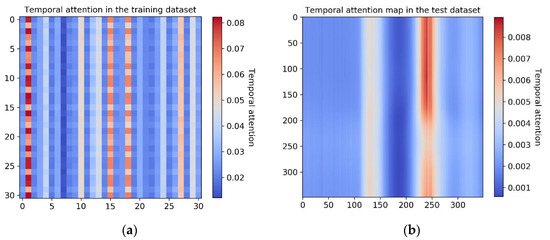 The temporal query, key, value used to calculate the temporal Multi-Head attention are obtained from the . The temporal attention matrix . According to Equation (7), in our application, the shape of the obtained temporal feature map is (31, 31) during training, and (349, 349) during testing.