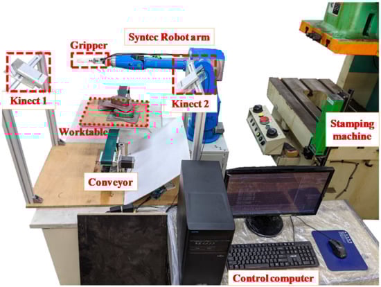 Under the trend of Industry 4.0, the concept of unmanned factories has dramatically emerged. All the governments over the world are also promoting smart manufacturing policies. It is expected that by developing unmanned smart factories to cope with the current shortage of labor, many manufacturers have introduced production lines combined with the robotic arm. Especially, in the metal forming industry, manual work in the current situation still plays an important role [1]. Hence, to improve production efficiency and reduce labor costs, as well as reduce the danger of human loss when working with the high-temperature workpiece in the hot-stamping process [2], it is required that the objects are first arranged and placed in a position, and then the robot arm is used to pick up and unload the materials to achieve the loading and unloading of the objects. The pre-work then is more troublesome. In order to fully achieve automation of new-generation smart factories, the combination of robotic arms and visual images has gradually become the current development trend. Handreg et al. [3] illustrate an idea to convert the current standard cold forming process of curved panels in the shipbuilding industry to computerized process control and quality examination using a conventional press, crane set up, and point cloud model based on a 3D vision system to monitor the production process successively. As a suggestion for our study to utilize three-dimensional images in the stamping industry, we have processed the point cloud to estimate the six-axis degree of freedom position and feature point information of hot-stamping workpieces. The latest modern Microsoft Azure Kinect camera [4], which is an application of the Time of Flight (ToF) principle [5], is the vision device used for this application to establish a 3D point cloud model in the scene. Later, the point cloud is leveraged to process the 3D point cloud data through a point-to-feature matching algorithm [6] to identify the stamping workpiece and its 6-DoF (6 degrees-of-freedom) position. The stamping workpieces in this study are placed on a conveyor to perform dynamic pick-and-place. Guo et al. [7] have a similar method of using a Kinect camera and a laser scanner to construct the point cloud and identify the position of the fruits, which were later used for harvesting. Compared to their research, a system with two depth cameras calibrated by stereo calibration in our study will generate both a target model point cloud and a reference model point cloud. Hence, the demand for a lower processing time as well as accuracy can be met. Moreover, setting up two cameras with two different viewing angles also allows the point cloud to fully model the object with just one scan. After the 6-DoF position of the workpieces is figured out, they will be transferred by the conveyor and the robot arm will pick them into the stamping die. Zheng et al. [8] stated that in a hot-stamping production line of high-strength steel, in order to evade oxidation and plasticity reduction when the temperature falls, the sheet metal has to be shifted from the furnace to the stamping die as quickly as possible. Therefore, they have proposed a method of synchronizing the motion of the feeding system. A description related to the velocity of the conveyor and the moving speed of the robot is executed for the purpose of dynamic transmission as our main goal of this study. After being placed into the machine, the system will trigger a signal for stamping to move and complete stamping. Finally, the system achieves the dynamic workpiece feeding process.